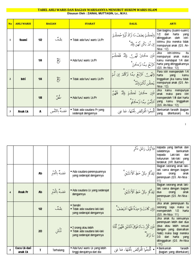 - ½: anak perempuan tunggal, cucu perempuan tunggal, saudari kandung tunggal, saudari sebapak tunggal, suami jika istri tidak punya anak.